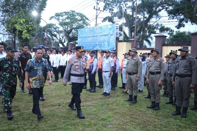 Humas Polres Kotamobagu - Guna mengecek kesiapan personil pengamanan Natal tahun 2025 serta Tahun Baru 2026, Polres Kotamobagu melaksanakan gelar pasukan di lapangan upacara Mapolres Kotamobagu (19/12/2025) dalam guyuran hujan.