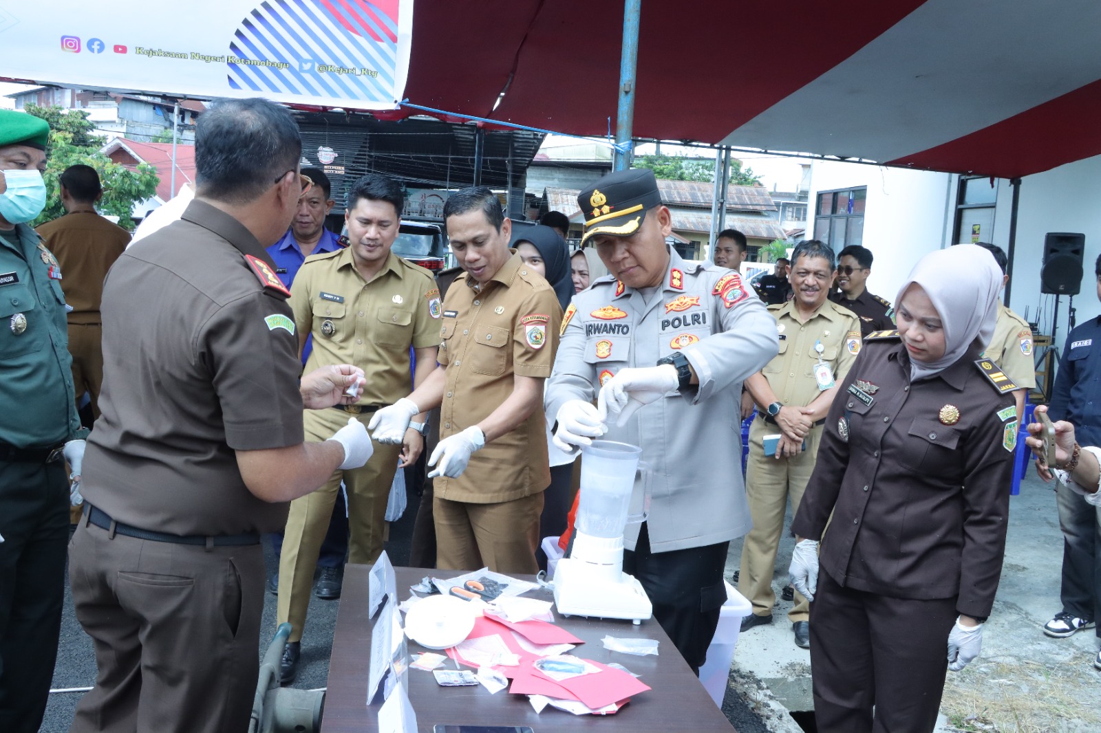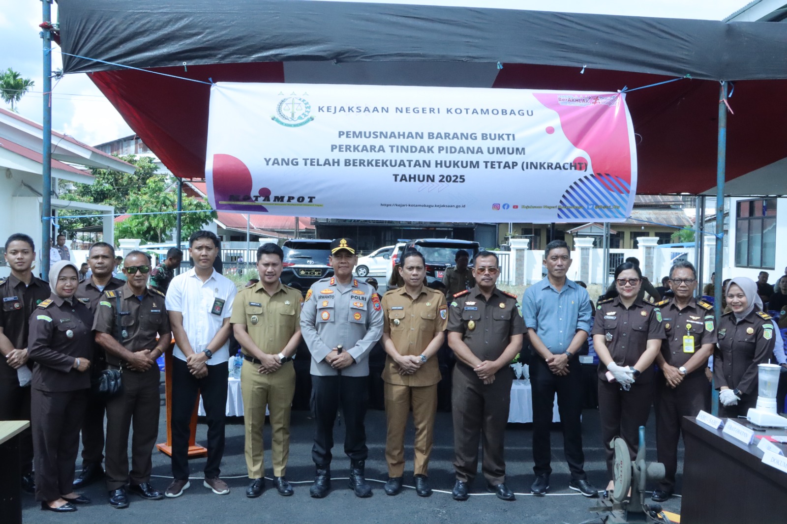 Pemusnahan barang bukti dipimpin langsung oleh Kepala Kejaksaan Negeri Kotamobagu, Saptono, SH, Turut hadir Wali Kota Kotamobagu dr. Wenny Gaib, SpM, Wakil Wali Kota Kotamobagu Rendy Virgiawan Mangkat, SH, MH,  unsur Forkopimda, serta pimpinan instansi terkait lainnya.