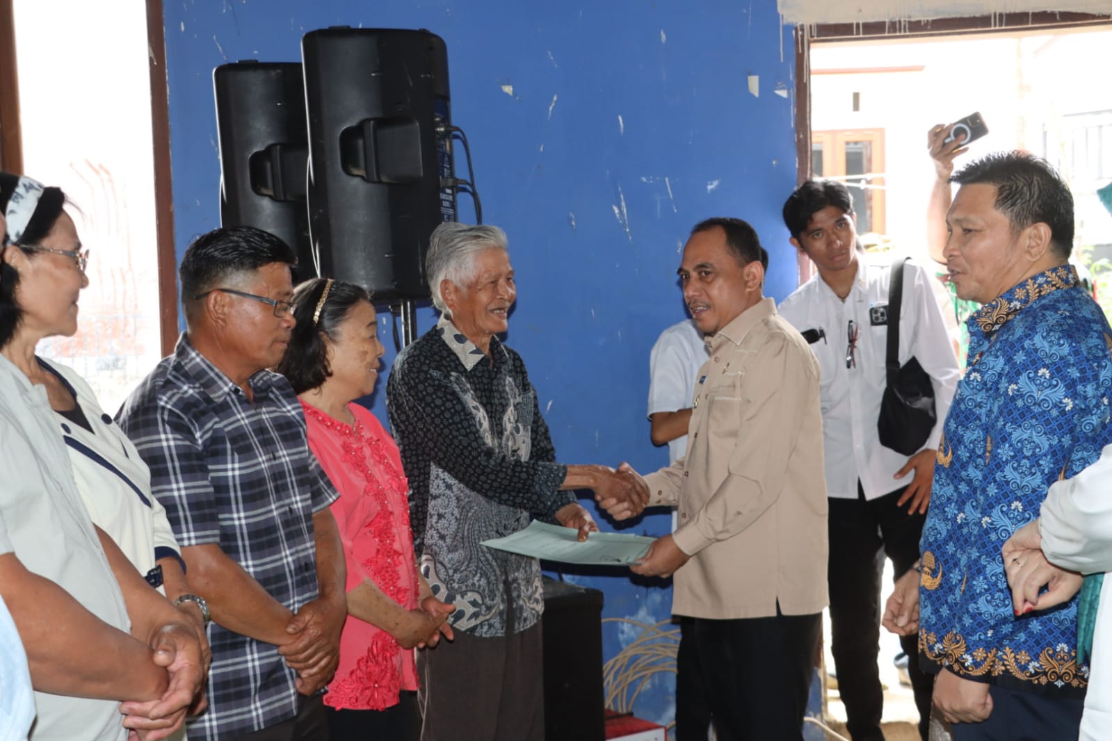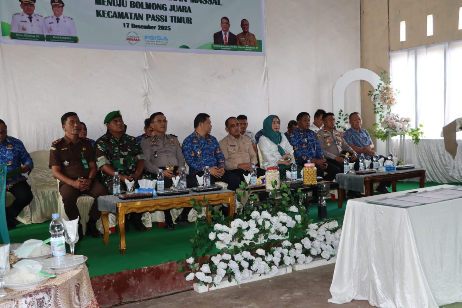 Rombongan Bupati Bolaang Mongondow tiba di Balai Pertemuan Umum (BPU) Desa Singgsongon Induk untuk menghadiri pelaksanaan pernikahan massal yang diikuti 100 pasangan, dengan kehadiran Wakil Bupati Bolmong, unsur TNI-Polri, Kejaksaan, pimpinan SKPD, pemerintah kecamatan dan desa, serta para sangadi se-Kecamatan Passi Timur.