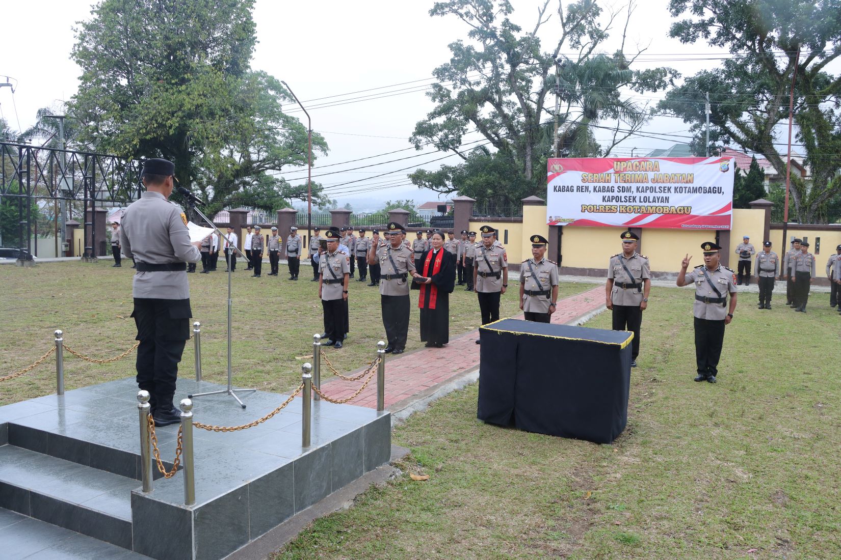 Adapun pejabat yang melaksanakan serah terima jabatan yakni Kabagren dari AKP Muh. Ilham Mattulangi, S.Sos kepada AKP Donal S. Ngalimin, SE, kemudian Kabag SDM dari AKP Donal S. Ngalimin, SE kepada AKP Muh. Ilham Mattulangi, S.Sos. Selanjutnya, Kapolsek Kotamobagu dari AKP Noldie Rimporok, SE kepada AKP Sahir Budi Mantoyo, SE, MAP, serta Kapolsek Lolayan dari AKP Rusdin Zima SE kepada IPTU Johan Atang, STh, SH, MA.