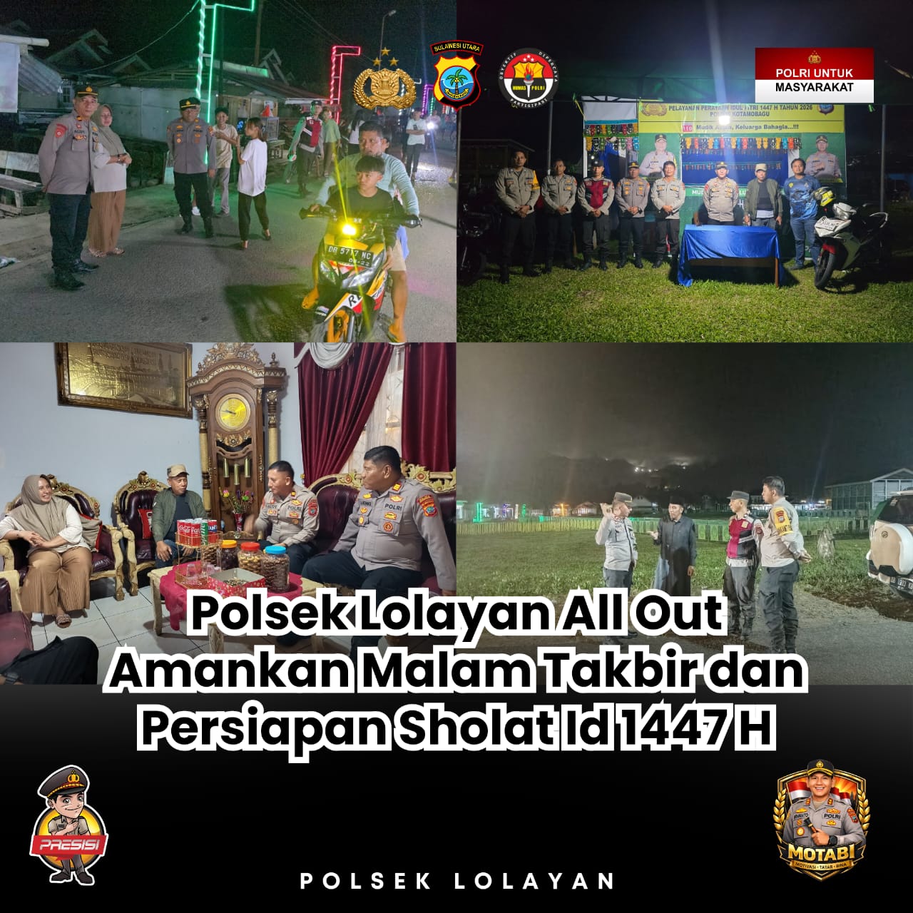 Polsek Lolayan – Kepolisian Sektor (Polsek) Lolayan menunjukkan komitmen penuh dalam menjaga kekhusyukan hari raya Idul Fitri 1447 Hijriah. Di bawah komando langsung Kapolsek AKP Johan Atang, S.H, S.Th, M.A, M.Pd, personel Polsek Lolayan dikerahkan secara all out untuk mengamankan malam takbiran hingga persiapan lokasi Sholat Id, Jumat (20/03/2026).