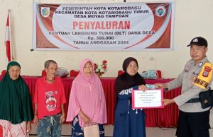 Humas Polres Kotamobagu - Bhabinkamtibmas Desa Moyag Tampoan turut serta mendampingi kegiatan penyaluran Bantuan Langsung Tunai (BLT), Sabtu (09/11/2024).