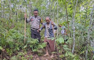 Humas Polres Kotamobagu – Bhabinkamtibmas AIPDA Sumitro Tegela bantu evakuasi salah satu warga masyarakat binaannya yang telah mengasingkan diri di hutan, Sabtu (17/06/2023).